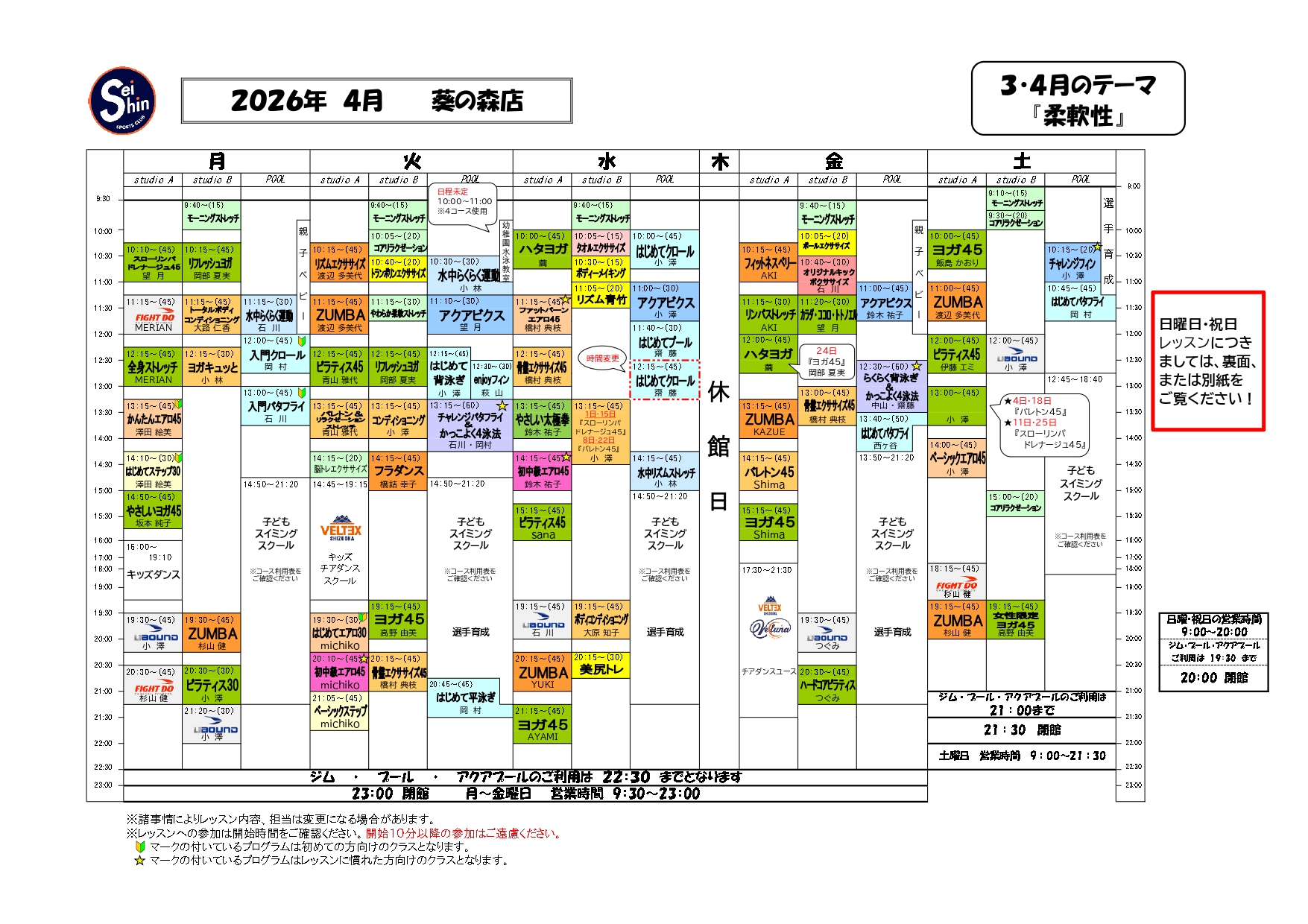アクアビクス ↓ 休講 |
